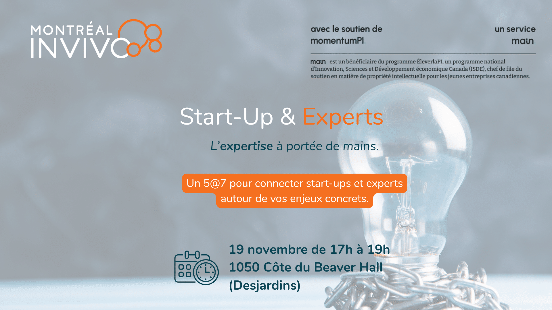Montréal InVivo et Main sont heureux de vous inviter à Start-Up & Experts : l’expertise à portée de main, un 5@7 conçu pour connecter les start-ups aux experts et ressources clés pour leur développement.