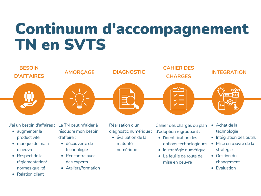Au niveau provincial comme au fédéral, la transformation numérique des entreprises, en particulier des PME, a été définie comme une priorité. Cependant, pour les entreprises du secteur des SVTS, la transformation numérique peut sembler complexe et coûteuse. Les entrepreneurs ont besoin d’un interlocuteur privilégié qui comprend leur réalité et qui peut les orienter vers les ressources les plus adaptées.